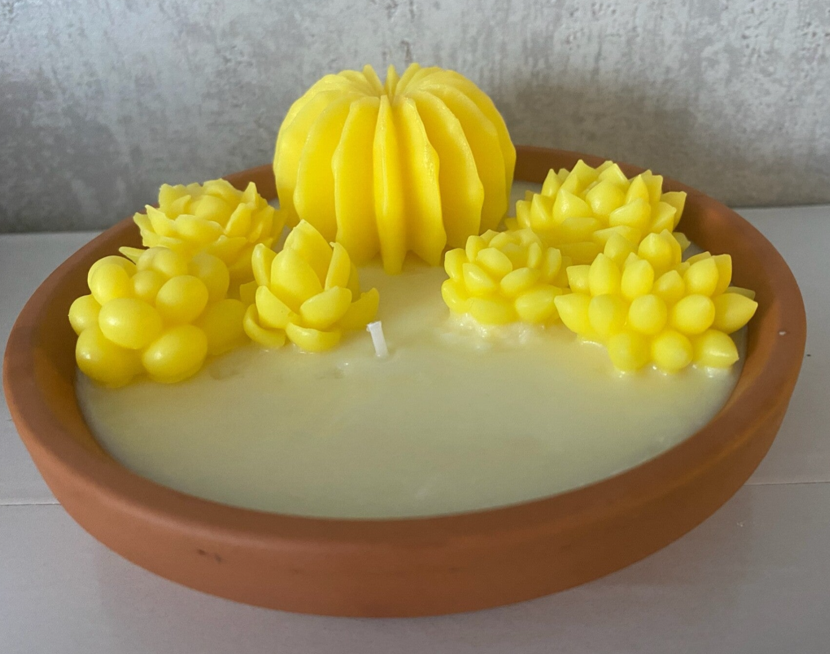 De kaars heeft een royale breedte van 14 cm en een hoogte van ongeveer 6 cm, waardoor het een indrukwekkend middelpunt is voor je tuintafel, balkon of terras. Centraal in dit kaarslandschap staat een grote, opvallende cactus van circa 9 cm hoog met zijn kenmerkende geribbelde structuur en twee armen die elegant omhoog reiken. Om de grote cactus heen liggen zes prachtige, gele succulentenkaarsjes, elk met gedetailleerde bladeren, die de woestijntuin compleet maken. Steek hem aan en geniet van de warme gloed en de rustgevende ambiance die deze unieke kaars creëert.